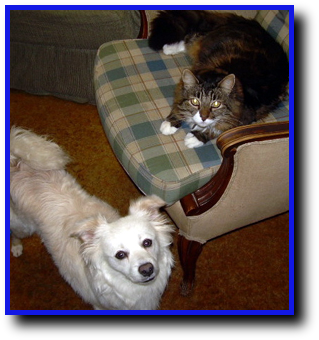 Here's a picture of me with my new "brother" - a cat named Kitty - who weighs almost as much as me! We have a sort of easy truce right now. I want to play, but he is being a little more mature than I am and is taking a wait and see attitude. He's only batted at me once! He lets me sniff his nose!